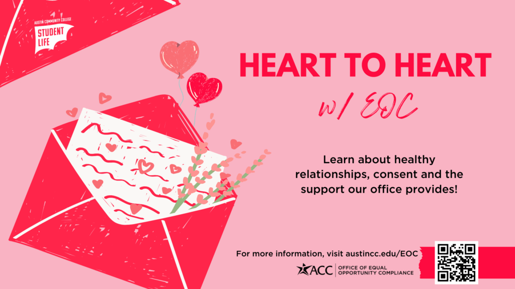 The EOC is dedicated to providing an experience in which all students and employees can participate fully at events. To ensure everyone can engage comfortably and meaningfully, please contact us at equalopportunity@austincc.edu if you require any accommodations. Connect with us to share ideas for future programming or explore volunteer opportunities!