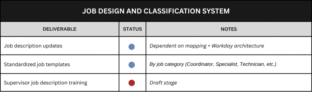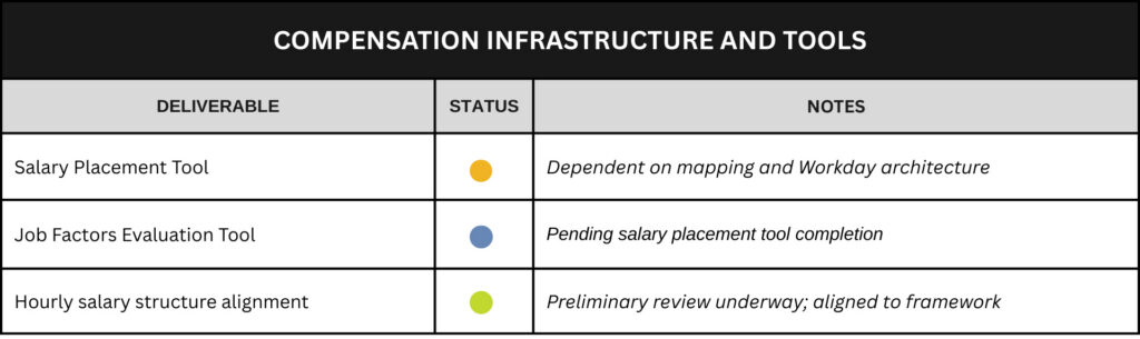 This work is being carried out in phases through 2027, with significant progress underway in 2026. Implementation is not a single launch—it is the deliberate alignment of systems, policies, tools, job design, and governance so compensation decisions become consistent, explainable, and durable over time.